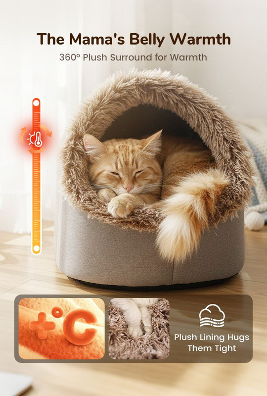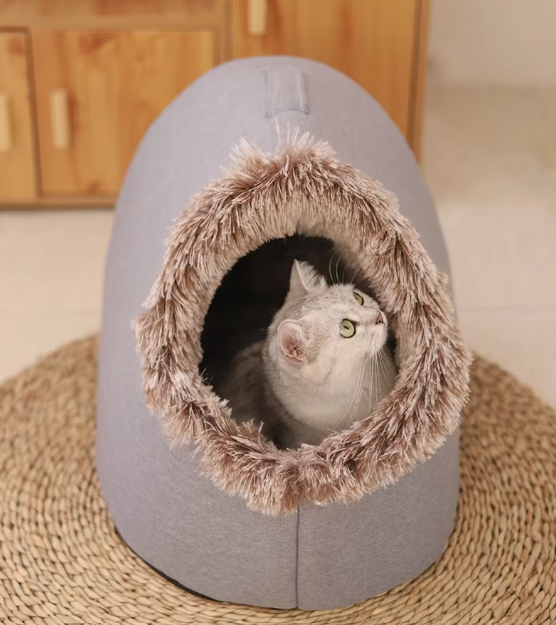 البيت مصنوع من قماش ناعم مع حواف فرو، كيوفر للقط إحساس بالدفء خصوصاً فالأيام الباردة.